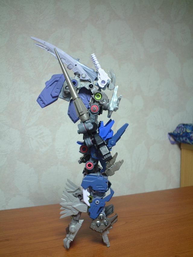 | それは死神・・・。 それは戦妃・・・。 果てることなき闘争本能。 満たされることなき渇望。 全てを超え、 全てを陵辱し、 全てを暴虐する・・・。 全ては、 本能の促すままに・・・。 Hmパンクラチオンのバトル中に突如現れる謎のゾイド。 骨翼の戦妃の名はその背中の翼の形状からいつしか呼ばれるようになった名であり、本来の名前は不明。 通常BLOXであるにもかかわらずコクピットがなく、 周囲からの電波干渉による遠隔操作の痕跡もないことから完全な無人機と思われる。 カテゴリーM(中型)サイズでありながらその性能はカテゴリーL(大型、レーヴァティンや紫電はこのクラス)のゾイドと互角以上にわたりあう。 このゾイドがカテゴリーLとわたり合えるのは、ひとえにその化け物じみたスピードのためである。 人型とゆう全く飛行に向かない体形にもかかわらず随所に搭載されたマグネッサーシステムや 通称の由来となった骨格状の翼、腰部に装備された大型のフライトユニットによりその飛行能力は飛行ゾイド並であり、 空中での急停止や直進からの上下への90°の上昇・下降、直進しながら体だけを反転させるといった 従来の飛行ゾイドでは想像もできなかった空中戦闘を行う。 武装らしい武装は腕部のマグネイズスピアのみで、フレーム強度もさほど高くないと思われ (実際、カテゴリーMとの戦闘時に腕を引き千切られている)、 戦闘能力は低いように思われるが、実際はそのとおりである。 しかし、このゾイドの本当の恐ろしさは背中の骨格状の翼である。 この翼は高速で小刻みに振動させることにより周囲に大規模なマグネッサーの干渉をおこす。 これにより飛行にマグネッサーシステムを使用するゾイドは飛行不可能となり、 マグネッサーでBLOXやパーツを繋いでいるBLOXゾイドはパーツ単位にバラバラに分解される。 これらの能力を駆使し、このゾイドはさまざまなバトルに乱入、ゾイドを破壊し、そのパーツを奪っていくが その目的は一切不明である。 期末テスト&一学期終了&夏休み突入記念ウェ―――――――(○W○)――――――――!!!! 皆さん、お久しぶりです(でも1週間くらいですが)。 ここ最近テスト勉強が忙しくて書き込みしてなかったんですが本日ようやくテスト終了。 その記念です(ォ テスト勉強がはかどらずやけになって30分ででっち上げたゾイドですがなかなかどうしてお気に入り。 スペ、カリギュラ嬢、バハムッ子(次回白亜登場)とパーツ被ってないので置く場所に困ってます。。。 尊敬すべき人型職人(略)さんの Humanoid BLOX に殴りこみ&勝手なストーリー作りの嫌がらs(ryもと意、投稿。 参加OKとのことだったので・・・、 月見さんのカテゴリーでんでんも取り入れてみましたが そのあたりは(略)さんと月見さんの書き込みを参照してください。 ちなみに上4枚はフルウェポン武装、その下3枚は軽装状態です。 下の2枚はフレームによるサービスカットw その内の上の写真は悩ましげな誘惑ポーズw投稿するときは是非入れたいと思っていたお気に入りカット。 下は悩ましげ誘惑ポーズ撮ってるときに宇宙からの電波を受信して1分ででっち上げた妹機とのツーショット。 なにげ妹の方が構造が単純だから稼動範囲は広かったりします。 妹機のほうは、タブン、後ほど投稿します。タブン 写真の数多すぎた・・・orz でも直しません(ォィ 作者の戯言:マジンガーのパイルダーオン。 頭に合体は激しく危険だと思うのは私だけではないはず・・・。 |