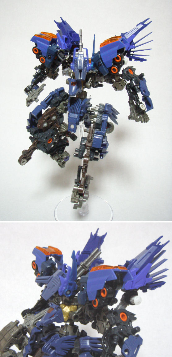 衝撃的な格好良さです。 メインはやはり背中のスラスターなのでしょうけど、個人的には太股裏のブースターノズルがツボです。この組み方は気付かなかった! おそらく20センチ前後のサイズだと思うんですが、大きな肩と小顔の所為か巨体な印象も受けます。そのお陰か細い脚が引き立って見えますね。 とにかく、馬人さんのフェチが盛り込まれてますねw そして頭部のツノのスミ入れがニクい! | |||||
