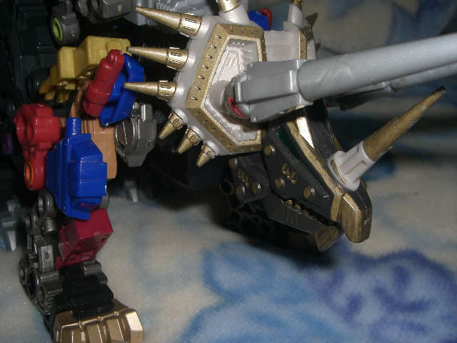 | トリケラトプスに似た合成獣(キメラ) ゾイド核を脅かす排気ガスを出すがフルパワー時のみ。 射撃系の武装は少なく格闘能力に優れている。 バイオゾイドに続く他のゾイドとは異なる。コックピットが他のゾイドの頭に似ていることや、ゾイド核を脅かす排気ガスなどの特殊な機能がある。 ゾイドはこのガス(ゾイド核を脅かす排気ガス)によってガスが消えるまで、核停止状態に陥る。(焔を身に纏うことで防げる) 研究の結果、もしかしたら全てのゾイドの野生体の祖先を使用した古代のゾイドではないかと推測される。 このゾイドはスティルアーマーの頭にマグネイズスピアを2本取り付け、ボディの改装などを施した簡単なゾイドです。 多分、このゾイドの頭は誰でも考えたことがあると思います |