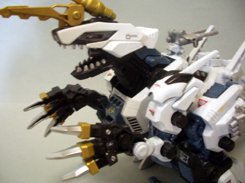 | 作品の設定: ガイロス帝国軍が開発した『ジェノザウラー』はオーガノイドシステムを搭載した初のゾイドであり、西方大陸戦争中期に多大な戦果をガイロス帝国軍にもたらした。その後、改造機である『ジェノブレイカー』や直系の後継機『バーサークフューラー』の登場後も、主力戦闘ゾイドとしてガイロス、ネオ・ゼネバス両軍で幅広く使用されている。 ネオ・ゼネバス帝国の攻撃により事実上崩壊し、『へリック・クルセイダーズ』としてゲリラ的に活動しているへリック共和国軍は、来るべき決戦に備え、ゴジュラスギガ、アロザウラー、ゴルヘックス等の高性能ゾイドの配備を進めていたが、主力ゾイドとしてのライガー系高速戦闘ゾイドの強化・発展はすでに頭打ち状態であった。高速戦闘に特化したライガー系ゾイドよりも、様々な戦況に対応できる総合性能の高いゾイドが必要となっていたのだ。同時に、ゴジュラスギガを護衛するアロザウラー部隊の隊長機としての大型ゾイドが必要とされていた。 そこで共和国軍開発部は、兵器としての総合力の高いジェノザウラーに着目した。同盟関係にあるガイロス帝国軍からの技術協力を取り付け、配備計画を進めてたものの、ジェノザウラーは荷電粒子砲等、共和国軍にとっては不得手な技術が使用されており、また単体での能力に限界があるため、開発部はジェノザウラーの独自の改造案を多数作成し、試作に入った。 この『ジェノクロウズ』はその開発案の一つで、旧大戦時のゾイド『ゴッドカイザー』を参考にしている。ゴッドカイザーは旧大戦時において限定的な条件ながら『ギル・ベイダー』を撃墜するなど、特筆すべき戦闘力を持っていたが、ZAC2105年現在の技術では復活が困難であったため、近縁種であるジェノザウラーの改造と言う形となった。機体には格闘兵器、射撃兵器がバランスよく装備されているが、特に格闘能力に重点が置かれている。頭部のザンブレイカー、腕部のハイパーメタルクロー、加重力衝撃テイルなどがそれで、対大型ゾイド戦を想定した武装となっている。口腔部の荷電粒子砲は技術的、経済的問題から拡散ビーム砲に変更されているが、その副産物として機体各部の荷電粒子砲用ラジエーターが不要となり、機体の軽量化、装甲の強化が可能となった。 『ジェノクロウズ』のテスト結果は良好で、数機が試作されたものの、砲撃戦に特化した対ゴジュラスギガ用大型ゾイド『セイスモサウルス』の登場により配備計画は見直され、ジェノクロウズが量産化されることは無かった。代わって、平行して研究されていた改造プランを発展させ、様々な新技術が取り入れられた『凱龍輝』が登場することとなったのである。 製作とコメント: ―最近、私はある異変を感じていた。心の奥底から突き上げる黒い衝動、いわれの無い悲しみが、私の指先を改造ゾイド製作に駆り立てる。それはまるで、『ゾイド終焉のA級戦犯』として蔑まれてきた旧末期ゾイドの怨念のようだった・・・― さて、いきなり謎な書き出しですが(死) 今回はかの悪名高いゴッドカイザーをモチーフにしてみました。最近私の作品にも旧シリーズ末期の香りが漂ってきたような気がします。何というか、キングライガーからゾイドに入ったカワリモノなので、個人的には末期シリーズのデザインにもそんなに抵抗は無い(キン○バロンとかアイスブ○イザーとかは論外ですが…)のであります。そしてなによりも「自分には傑作の誉れ高い中期シリーズ(コングとかウルトラとかマッドとか)的なものを作るほどの技量がない」と言う事に尽きます。 では、電波文は忘れて(ぉ)製作に移りましょう。 頭部はジェノの顔にレオストライカーの尻尾とゴドスの銃、そしてプラバンで作ったフェイスガードでゴッドカイザーらしくしました。 胴体はほぼノーマルなままです。スラスターノズルは脚につくアンカーにスラスターのパーツを貼ったものです。 腕部は肩アーマーのラジエーターをプラバンで塞ぎ、ジャンクパーツを貼って形状を変えています。爪はバスターイーグルのもので、基部はシールドライガーの前足を加工したもので、一応連動します。ゲッツ!みたいな動きになってしまいましたが…。 脚部も腕部と同じようにラジエーターをプラバンで塞ぎ、ジャンクを貼っただけです。 尻尾は無駄に手を加えてまして、まず上下さかさまにして、フシを一つ減らし、それらしくジャンクパーツを付けてあります。 背中の武器はシールドライガーからパクッたものです。 塗装は配色はゴッドカイザーに準じてはいますが、青色が安っぽくてイヤだったので、ブルーグレーにしてみました。個人的にはこの『MK−Uカラー』好きなんですよね。 |
