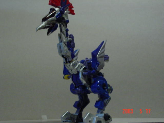 | 製作動機: ガンスナベースで鳥型を作ろうとしたらこんなのになりました(爆 制作方法: 頭:ガンスナの頭にパテやジャンクを貼りました。キャノピーの開閉は生かしてあります。 首:ガンスナの尾です。パテで繋ぎました。 胴体:そのまんまです。ゼンマイは生きてます。 足:前後逆につけました。この足を元に戻せばゼンマイが巻けるのでとりあえず3歩ぐらい歩きます。 翼:ガチャブロックスの部品を使いました。前後にクルクル回ります。 尾羽?:改造したネジでウェイトを取っています。 塗装:首、胴体、爪・・シルバー 翼の一部、足、耳?・・インディブルー トサカ・・レッド 設定: ヘリック共和国警察の暴走族取締り部署に配備される機体。 超高速で走り回る暴走ゾイドに追いつくスピードと瞬発力、旋回性能、バランスを備え、暴走機を捉える高感度センサー類も搭載。 西方大陸戦争時には口内機関砲を火炎放射器、電磁ネットミサイルを炸裂爆弾に換装し、帝国軍残党狩りや対ゲリラ戦に使用された。 主な装備: 口内機関砲(戦闘仕様は火炎放射器) 頭部レーダー 計測用スピードガン(戦闘仕様はビームガン) ブースター 電磁ネットミサイルポッド(戦闘仕様は炸裂爆弾) ストライククローX2 ウィングX2(戦闘仕様はカッターウィング |