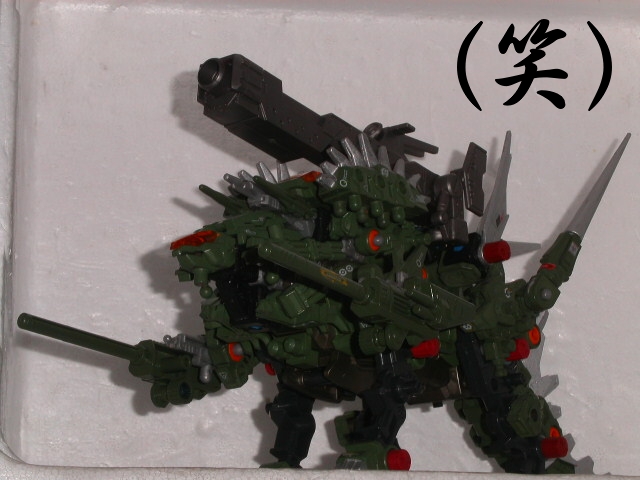 2004コロコロ4月号や、ワイツウルフのパッケージにのっている ケントロサウルスですね。 ベースがワイツウルフ、背中のトゲ、顔などがボルドガルド 手のスピア、尾部、などがデモンズヘッド 後ろ装甲のトゲがサビンガ 前足のキャノン、顔近くの手、背中のキャノンがウネンラギア ですね | |||||